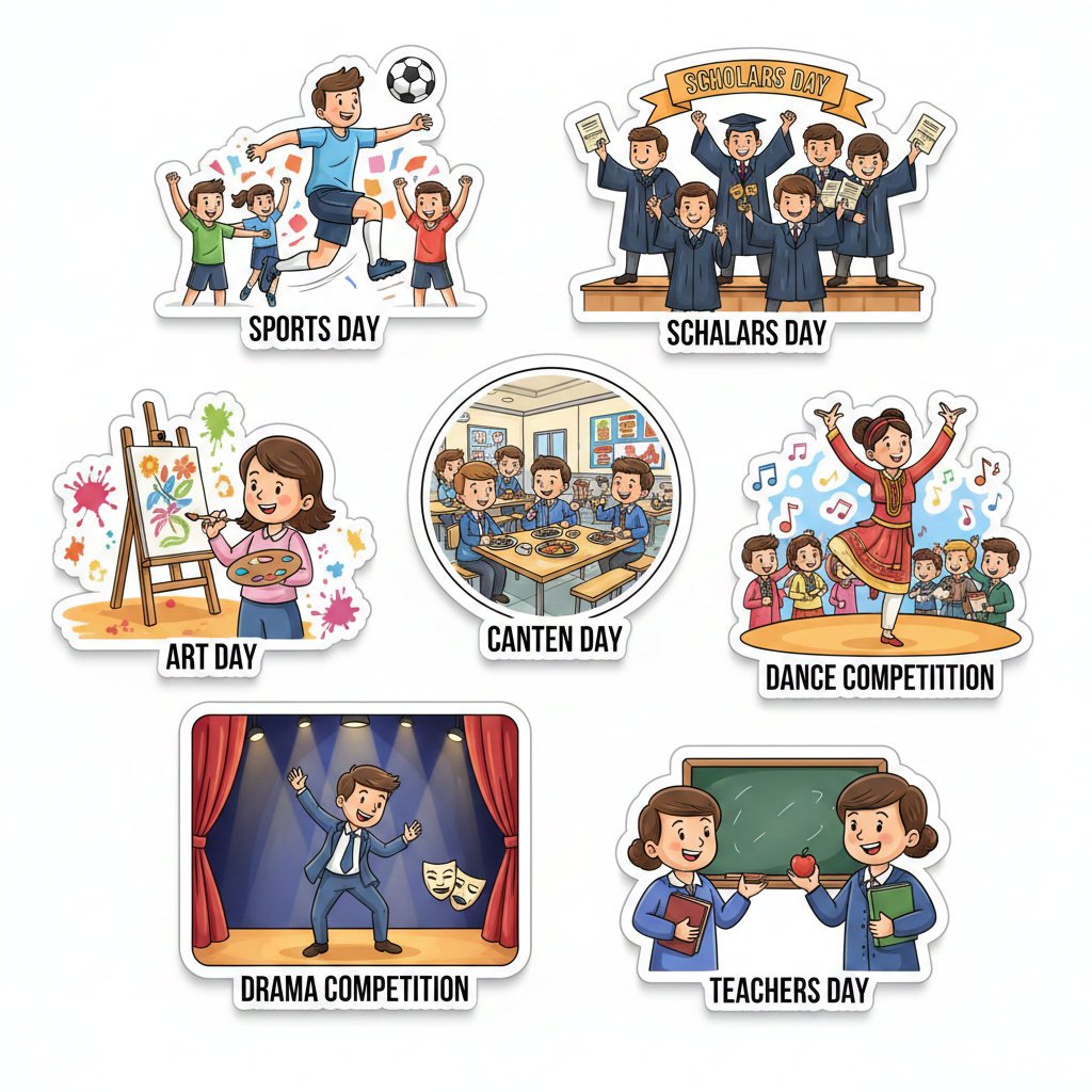School Celebration Sticker Pack honors the colorful events and special functions that make school life memorable. From annual days and cultural programs to talent shows and festive gatherings, these stickers capture moments of creativity, performance, and community. Designed to celebrate participation and expression, the pack encourages students to embrace their talents and enjoy shared experiences. Ideal for decorating planners, scrapbooks, and personal belongings, these stickers become keepsakes of joyful memories. School Celebration promotes confidence, creativity, and appreciation for school traditions. Each design reflects the excitement of preparation, teamwork, and performance, reminding students that school functions build communication skills and lasting friendships. This sticker pack transforms everyday surfaces into vibrant reminders of celebration, unity, and fun — highlighting how shared moments shape a positive school journey.